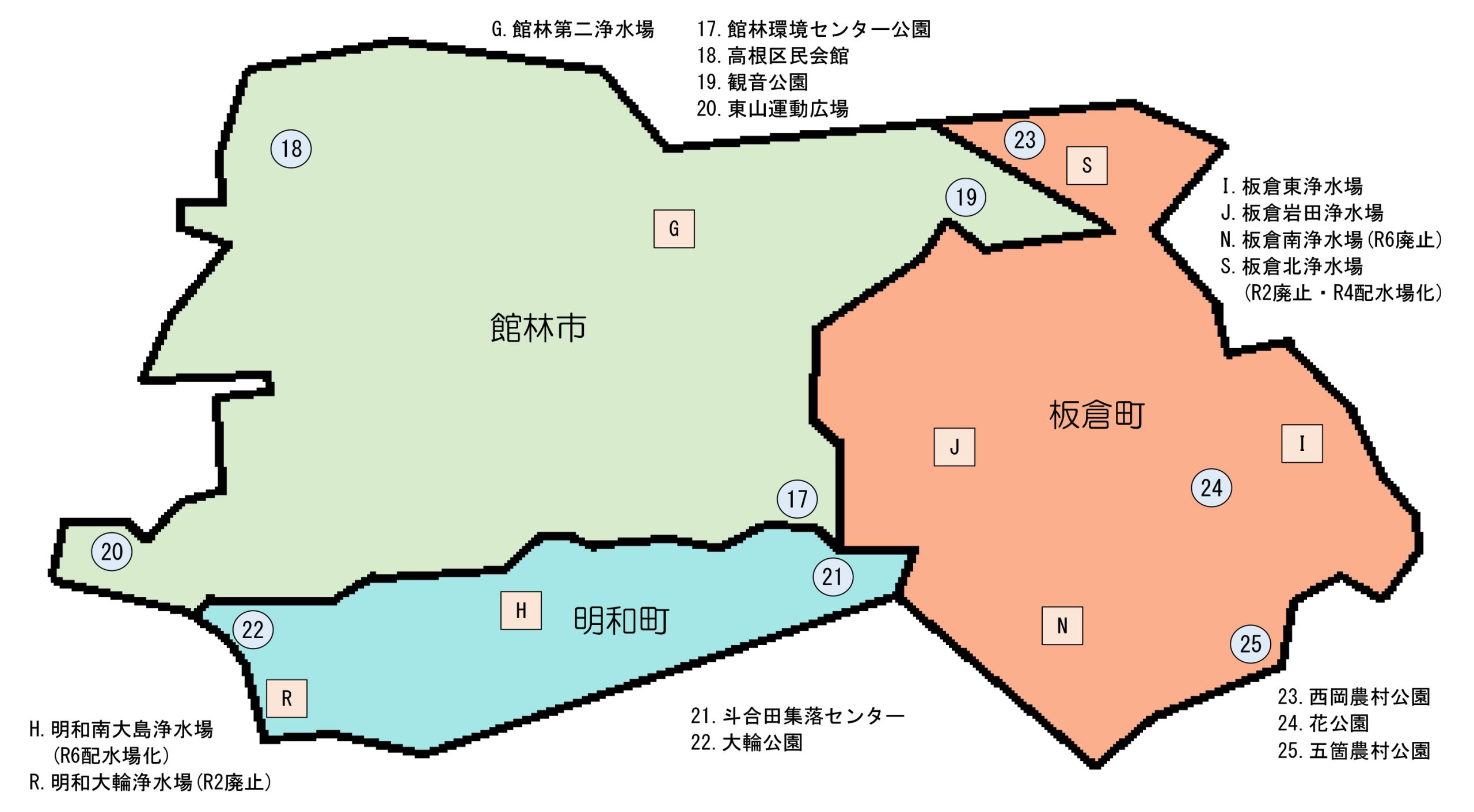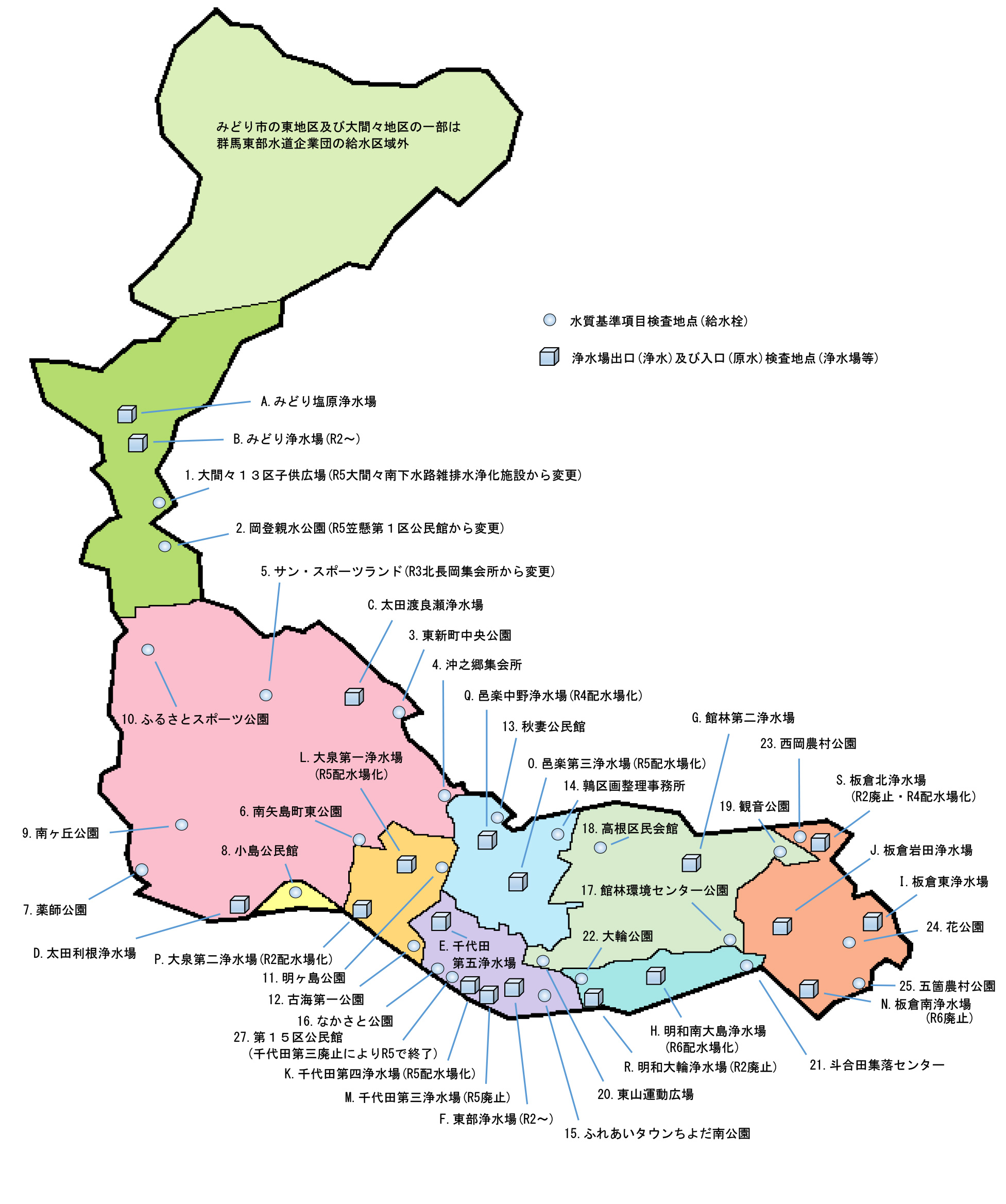 水質検査結果 水質情報 令和7年度水質検査結果みどり市給水栓1.大間々13区子供広場2.岡登親水公園浄水場出口及び入口A.みどり塩原浄水場B.みどり浄水場太田市給水栓3.東新町中央公園4.沖之郷集会所5.サン・スポーツランド太田6.南矢島町東公園7.薬師公園8.小島公民館9.南ヶ丘公園10.ふるさとスポーツ公園浄水場出口及び入口C.太田渡良瀬浄水場D.太田利根浄水場大泉町給水栓11.明ヶ島公園12.古海第一公園邑楽町給水栓13.秋妻公民館14.鶉区画整理事務所千代田町給水栓15.ふれあいタウンちよだ南公園16.なかさと公園浄水場出口及び入口E.千代田第五浄水場F.東部浄水場館林市給水栓17.環境センター公園18.高根区民会館19.観音公園20.東山運動広場浄水場出口及び入口G.館林第二浄水場明和町給水栓21.斗合田集落センター22.大輪公園板倉町給水栓23.西岡農村公園24.花公園25.五箇農村公園26.大久保農村公園浄水場出口及び入口J.板倉岩田浄水場I.板倉東浄水場令和6年度水質検査結果みどり市給水栓1.大間々13区子供広場2.岡登親水公園浄水場出口及び入口A.みどり塩原浄水場B.みどり浄水場太田市給水栓3.東新町中央公園4.沖之郷集会所5.サン・スポーツランド太田6.南矢島町東公園7.薬師公園8.小島公民館9.南ヶ丘公園10.ふるさとスポーツ公園浄水場出口及び入口C.太田渡良瀬浄水場D.太田利根浄水場大泉町給水栓11.明ヶ島公園12.古海第一公園邑楽町給水栓13.秋妻公民館14.鶉区画整理事務所千代田町給水栓15.ふれあいタウンちよだ南公園16.なかさと公園浄水場出口及び入口E.千代田第五浄水場F.東部浄水場館林市給水栓17.環境センター公園18.高根区民会館19.観音公園20.東山運動広場浄水場出口及び入口G.館林第二浄水場明和町給水栓21.斗合田集落センター22.大輪公園板倉町給水栓23.西岡農村公園24.花公園25.五箇農村公園26.大久保農村公園浄水場出口及び入口J.板倉岩田浄水場I.板倉東浄水場令和5年度水質検査結果みどり市給水栓1.大間々13区子供広場2.岡登親水公園浄水場出口及び入口A.みどり塩原浄水場B.みどり浄水場太田市給水栓3.東新町中央公園4.沖之郷集会所5.サン・スポーツランド太田6.南矢島町東公園7.薬師公園8.小島公民館9.南ヶ丘公園10.ふるさとスポーツ公園浄水場出口及び入口C.太田渡良瀬浄水場D.太田利根浄水場大泉町給水栓11.明ヶ島公園12.古海第一公園邑楽町給水栓13.秋妻公民館14.鶉区画整理事務所千代田町給水栓15.ふれあいタウンちよだ南公園16.なかさと公園浄水場出口及び入口E.千代田第五浄水場F.東部浄水場館林市給水栓17.環境センター公園18.高根区民会館19.観音公園20.東山運動広場浄水場出口及び入口G.館林第二浄水場明和町給水栓21.斗合田集落センター22.大輪公園板倉町給水栓23.西岡農村公園24.花公園25.五箇農村公園26.大久保農村公園浄水場出口及び入口J.板倉岩田浄水場I.板倉東浄水場令和4年度水質検査結果みどり市給水栓1.大間々南下水路雑排水浄化施設2.笠懸第1区公民館浄水場出口及び入口A.みどり塩原浄水場B.みどり浄水場太田市給水栓3.東新町中央公園4.沖之郷集会所5.サン・スポーツランド太田6.南矢島町東公園7.薬師公園8.小島公民館9.南ヶ丘公園10.ふるさとスポーツ公園浄水場出口及び入口C.太田渡良瀬浄水場D.太田利根浄水場大泉町給水栓11.明ヶ島公園12.古海第一公園邑楽町給水栓13.秋妻公民館14.鶉区画整理事務所千代田町給水栓15.ふれあいタウンちよだ南公園16.なかさと公園浄水場出口及び入口E.千代田第五浄水場F.東部浄水場館林市給水栓17.環境センター公園18.高根区民会館19.観音公園20.東山運動広場浄水場出口及び入口G.館林第二浄水場明和町給水栓21.斗合田集落センター22.大輪公園板倉町給水栓23.西岡農村公園24.花公園25.五箇農村公園26.大久保農村公園浄水場出口及び入口J.板倉岩田浄水場I.板倉東浄水場令和3年度水質検査結果みどり市給水栓1.大間々南下水路雑排水浄化施設2.笠懸第1区公民館浄水場出口及び入口A.みどり塩原浄水場B.みどり浄水場太田市給水栓3.東新町中央公園4.沖之郷集会所5.北長岡地区集会所6.南矢島町東公園7.薬師公園8.小島公民館9.南ヶ丘公園10.ふるさとスポーツ公園浄水場出口及び入口C.太田渡良瀬浄水場D.太田利根浄水場大泉町給水栓11.明ヶ島公園12.古海第一公園邑楽町給水栓13.秋妻公民館14.鶉区画整理事務所千代田町給水栓15.ふれあいタウンちよだ南公園16.なかさと公園浄水場出口及び入口E.千代田第五浄水場F.東部浄水場館林市給水栓17.環境センター公園18.高根区民会館19.観音公園20.東山運動広場浄水場出口及び入口G.館林第二浄水場明和町給水栓21.斗合田集落センター22.大輪公園板倉町給水栓23.西岡農村公園24.花公園25.五箇農村公園26.大久保農村公園浄水場出口及び入口J.板倉岩田浄水場I.板倉東浄水場令和2年度水質検査結果みどり市給水栓1.大間々南下水路雑排水浄化施設2.笠懸第1区公民館浄水場出口及び入口A.みどり塩原浄水場B.みどり浄水場太田市給水栓3.東新町中央公園4.沖之郷集会所5.北長岡地区集会所6.南矢島町東公園7.薬師公園8.小島公民館9.南ヶ丘公園10.ふるさとスポーツ公園浄水場出口及び